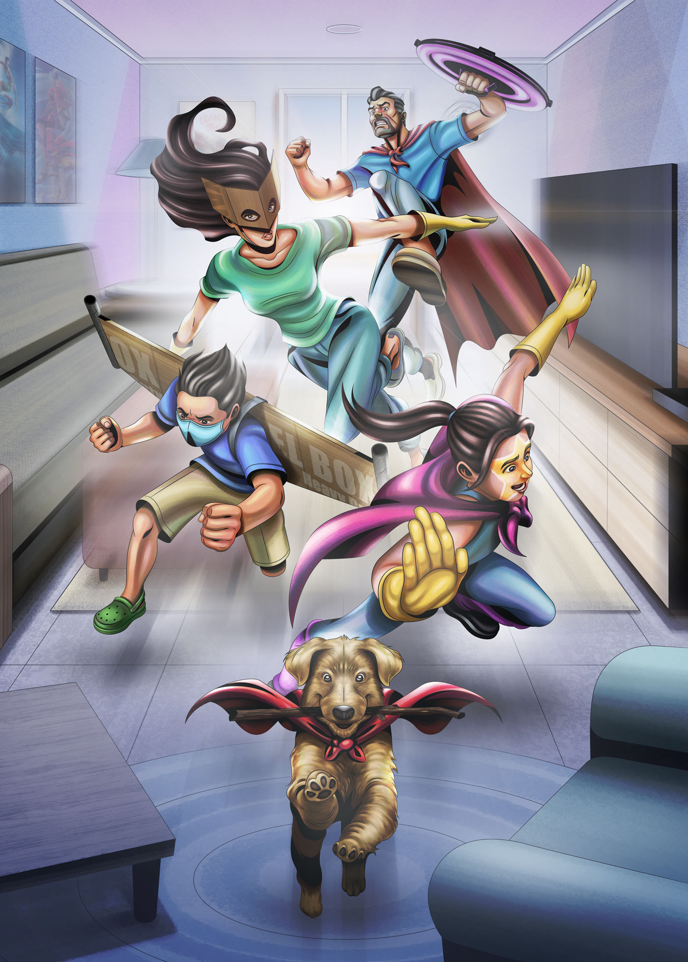 "Stay at home and be a hero! No need for spider bites, gamma radiation, magical rings and mythical hammers. Blankets, kitchen gloves and family will do." This is an illustration to encourage staying at home during the COVID-19 pandemic.
